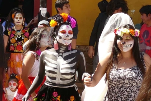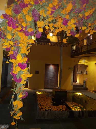 Nous voici donc à Oaxaca, une ville haute en couleurs, à taille humaine, qui abrite également quelques sites archéologiques (dont le plus connu est celui de Monte Alban que nous n’aurons hélas pas l’occasion de visiter), de superbes monuments (comme le Templo Santo Domingo par ex) et qui est devenue en quelques années un RDV incontournable pour les festivités del dìa de los muertos, touristes et mexicains s’y pressent et nous aussi avons voulu honorer ce rdv 😉